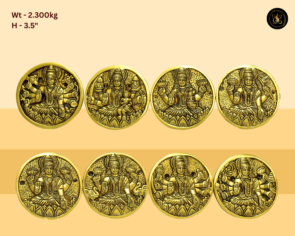 Bring home the divine blessings of all eight sacred forms of Ashta Lakshmi with this beautifully engraved plate set. Each round plate features one form of Goddess Lakshmi, symbolizing wealth, food, courage, victory, knowledge, fertility, power, and prosperity.
