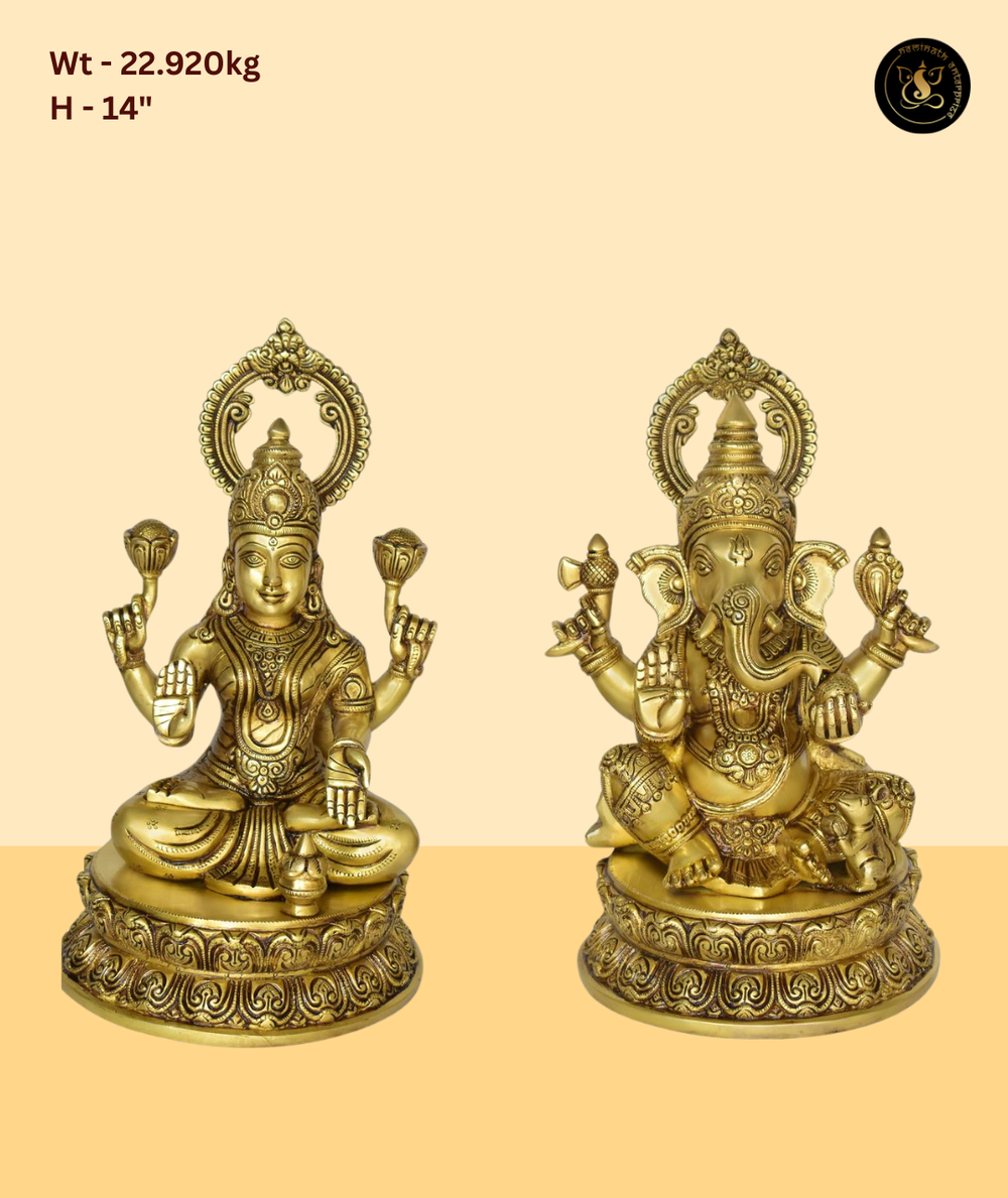 This beautifully crafted murti beautifully depicts Lord Ganesh and Goddess Lakshmi, radiating divine blessings and spiritual grace. Handcrafted with precision and devotion, it is an ideal addition to grand home temples, luxury gifting, premium spiritual interiors. A timeless piece from Neminath Enterprise, perfect for bringing prosperity and positivity to sacred spaces.