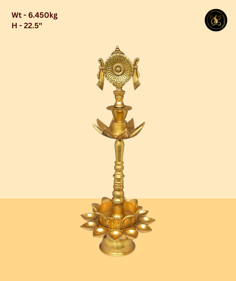 The Brass Chakra Lotus Diya Stand is a beautifully crafted ritual lamp featuring the Sudarshana Chakra finial above a tiered lotus diya arrangement at the base. The combination of the Chakra and lotus represents divine power and spiritual purity in Hindu tradition. Made from premium brass with detailed craftsmanship and antique gold finish, this stand creates a magnificent visual during multi-flame aarti. The tall elegant form makes it suitable for temples, large puja rooms, and festive occasions like Diwali, Navratri, and Satyanarayan katha.