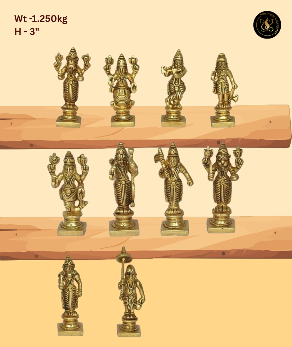 Brass embodiment of Dashavtar sequence, promoting cosmic order. 10-inch height; avoid chemicals.