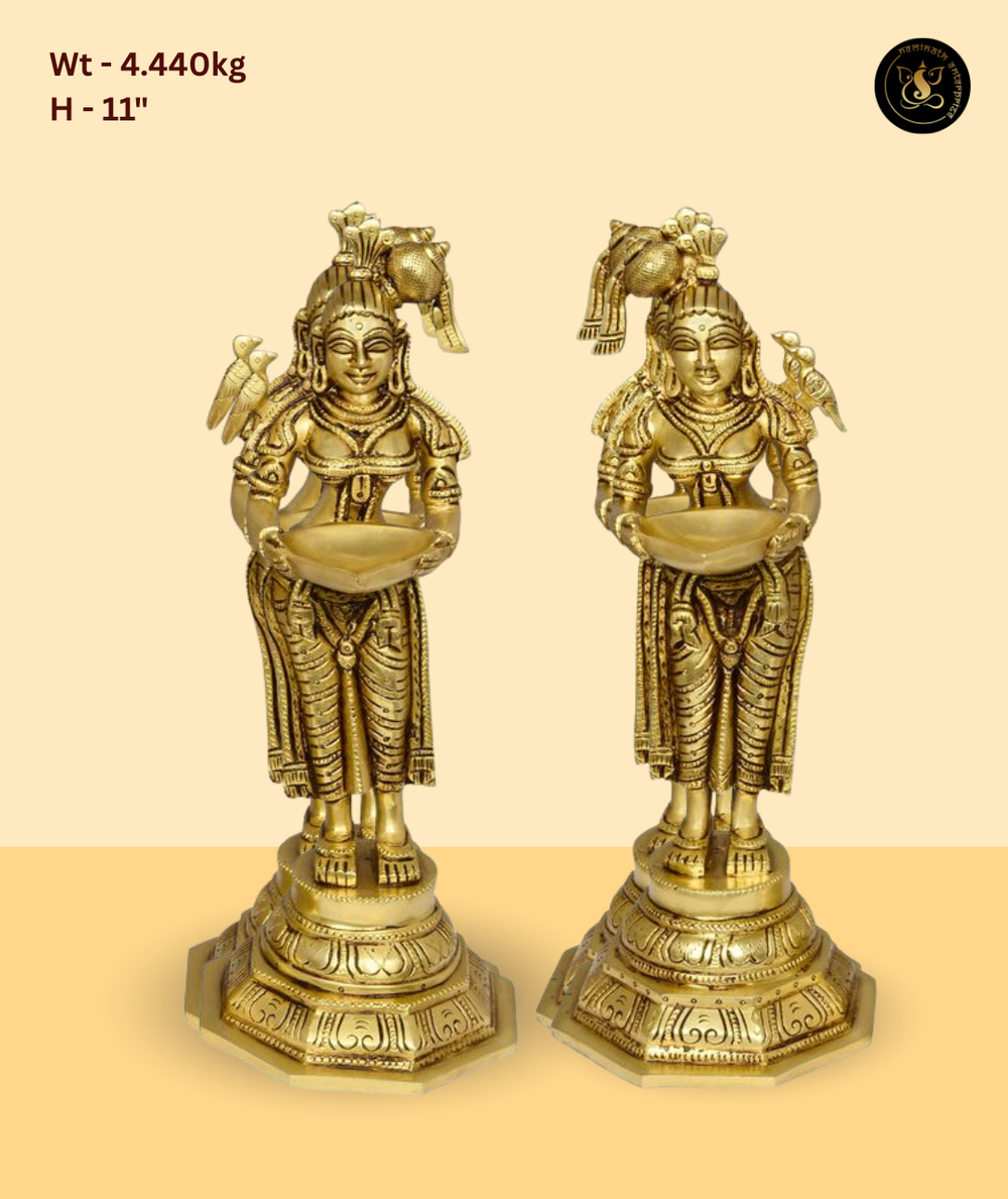 Suitable for home temples, religious ceremonies, and festive rituals, this brass deep lady idol enhances the spiritual ambiance while maintaining durability and long-lasting shine.