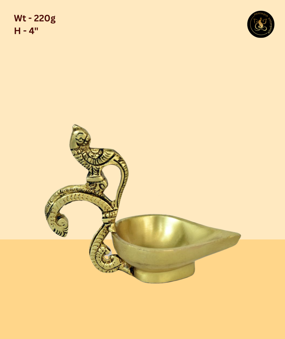 The Brass Peacock Diya Small with Bird Handle is a charming and delicately crafted small diya featuring a beautifully detailed peacock perched above the diya bowl with a curled decorative handle. The compact size makes it ideal for puja thalis, small home temple spaces, and gifting. Made from pure brass with antique gold finish, this diya is perfect for daily aarti, Diwali lighting, and offering during puja ceremonies. The peacock, a symbol of divine grace and beauty, adds a sacred and auspicious quality to this petite yet elegant ritual lamp.
