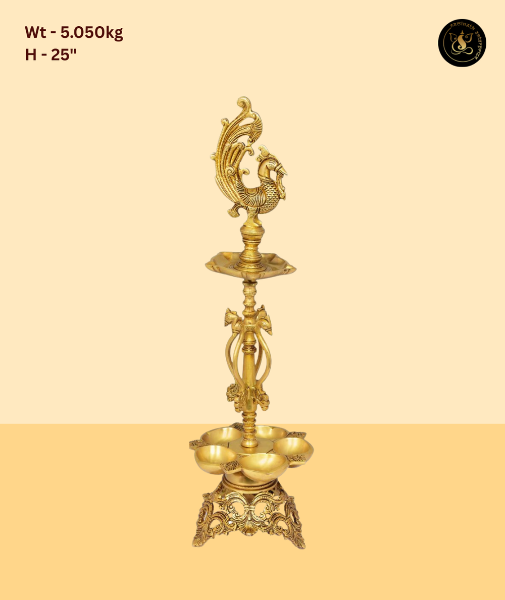 The Brass Peacock Tall Diya Stand is an elegant and grand puja lamp featuring a majestic peacock at the top with decorative feathers spread open, mounted on a tall ornate stand with multiple oil diyas at the base. This impressive piece serves as both a ritual lamp and a decorative centerpiece in any home or temple. Crafted from pure brass, the entire piece is finished in warm antique gold, adding grandeur to your spiritual space. The tall height makes it ideal for temple entrances, puja halls, and festive decorations during Navratri, Diwali, and weddings.