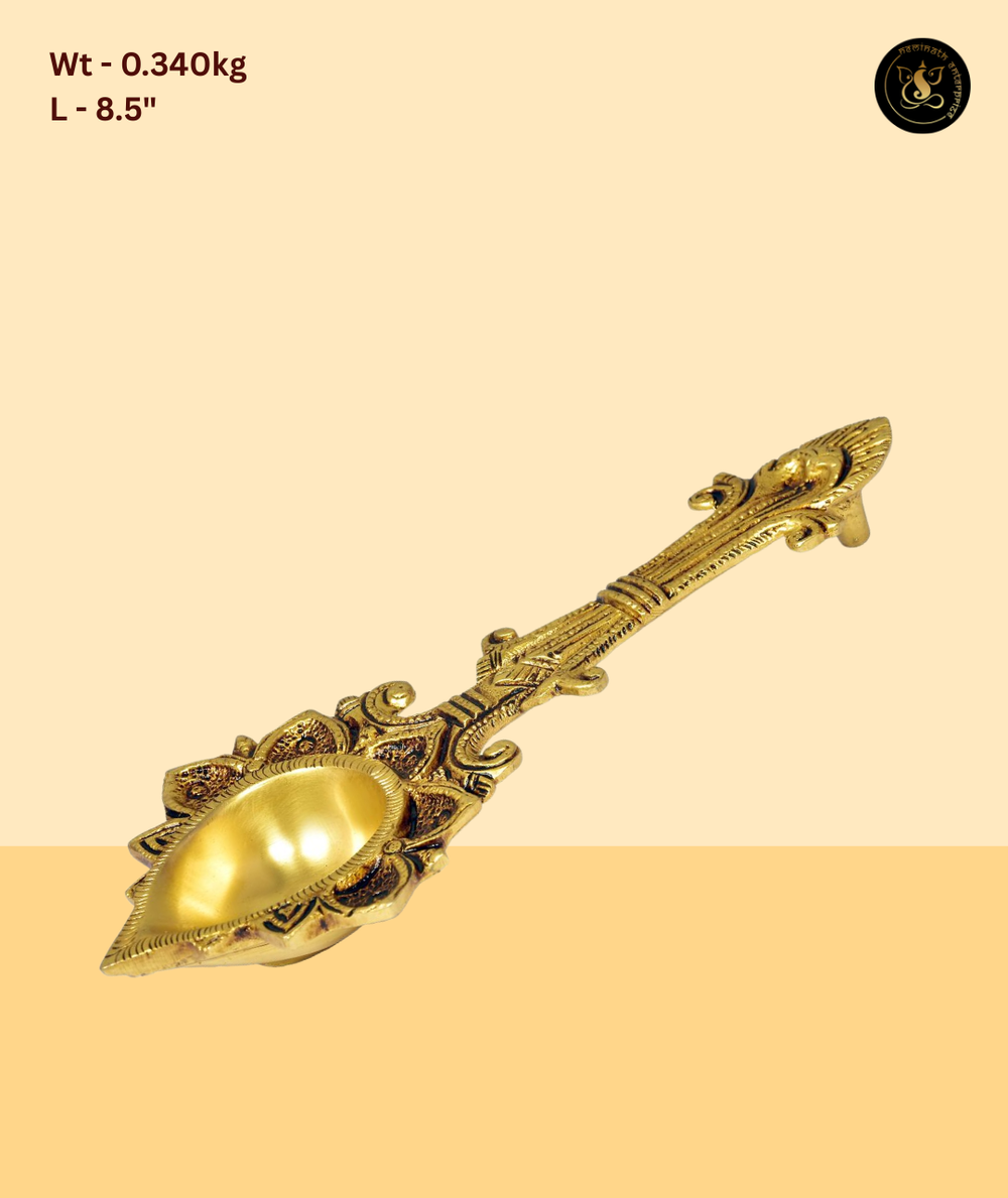 The Brass Puja Spoon Diya with Carved Handle is an artistically crafted religious item designed for use in traditional puja and aarti ceremonies. The handle features detailed carvings with symbolic motifs, and the elongated spoon bowl allows for easy use during rituals. Made from premium brass with an antique finish, this diya is sturdy and resistant to tarnish. The craftsmanship reflects centuries-old Indian metalworking traditions, making it a collector's item and a meaningful spiritual gift. Suitable for home temples, puja rooms, and gifting during religious and festive occasions.