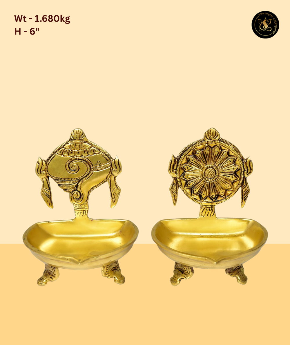 This majestic Brass Shankh Chakra Diya Pair with Lion Feet Base is a highly revered and auspicious set for any Hindu home or temple. The pair features two diyas, one adorned with the sacred Shankh (conch shell) motif and the other with the Chakra (divine wheel), both symbolizing Lord Vishnu's divine presence. The deep diya bowls rest on elegantly designed lion-footed bases, giving the set a regal and powerful appearance. Made from premium brass, these diyas are perfect for performing Satyanarayan puja, Lakshmi puja, and daily aarti. The set is ideal as a gift for housewarming, weddings, and religious celebrations.
