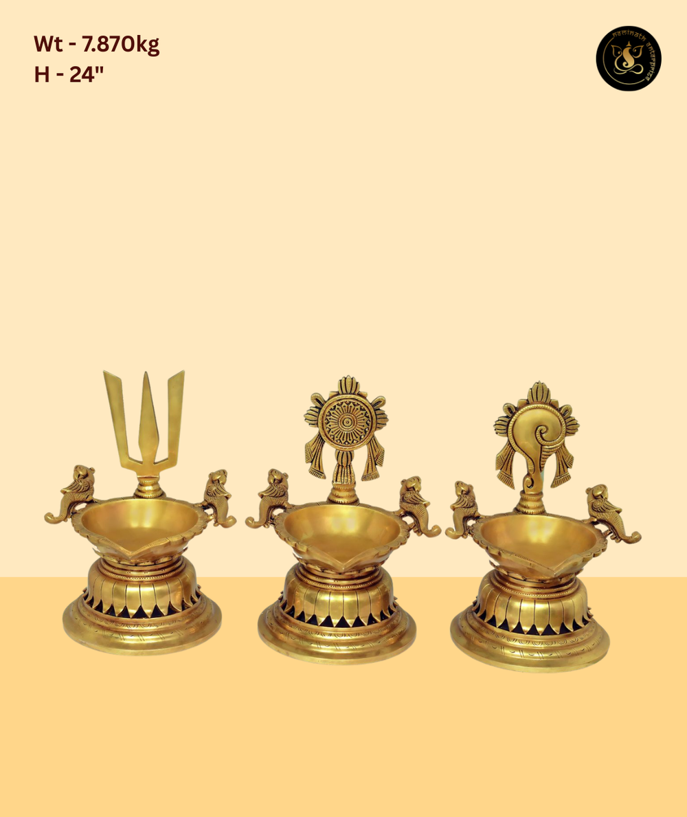 The Brass Trishul Shankh Chakra Diya Set of 3 is a highly auspicious set of three diyas, each featuring a different sacred symbol — the Trishul (trident of Lord Shiva), the Shankh (conch of Lord Vishnu), and the Chakra (divine wheel). Each diya is mounted on a lotus base with decorative lion accents. This set represents the divine trinity and is ideal for homes that worship all deities. Made from premium brass with antique gold finish, this set is perfect for home mandirs, pujas, Navratri, Diwali, and as a premium religious gift.