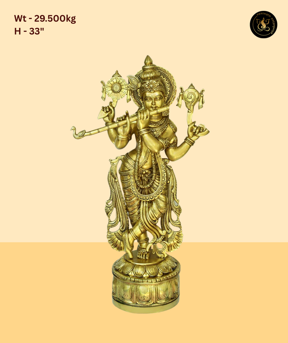 Material: Pure Brass | Finish: Antique Gold Brass | Weight: 29.5 kg | Height: 33 Inch | SKU: NE-KRSH-033 | Vendor: Neminath Enterprise | Ideal For: Puja, Temple Decor, Home Decor, Gifting | Occasion: Janmashtami, Diwali, Navratri, Housewarming, Wedding, Festivals
