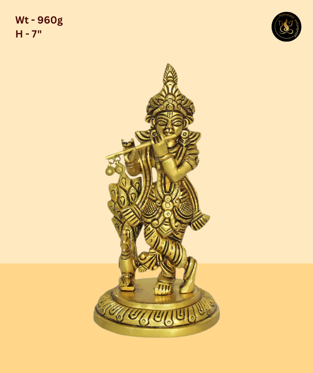 Material: Pure Brass | Finish: Antique Gold Brass | Weight: 0.96 kg | Height: 7 Inch | SKU: NE-KRSH-053 | Vendor: Neminath Enterprise | Ideal For: Puja, Temple Decor, Home Decor, Gifting | Occasion: Janmashtami, Diwali, Navratri, Housewarming, Wedding, Festivals