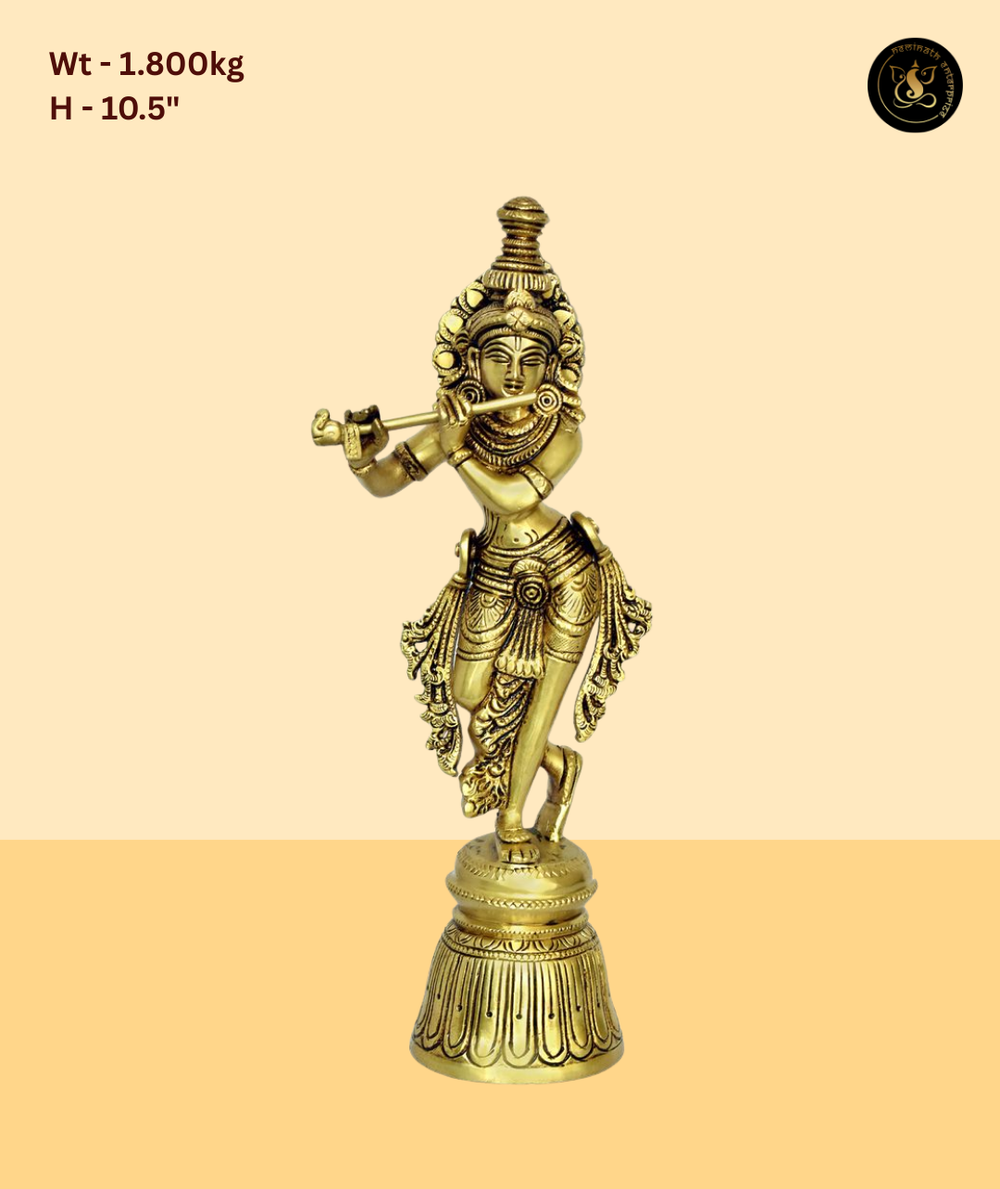 Material: Pure Brass | Finish: Antique Gold Brass | Weight: 1.8 kg | Height: 10.5 Inch | SKU: NE-KRSH-052 | Vendor: Neminath Enterprise | Ideal For: Puja, Temple Decor, Home Decor, Gifting | Occasion: Janmashtami, Diwali, Navratri, Housewarming, Wedding, Festivals