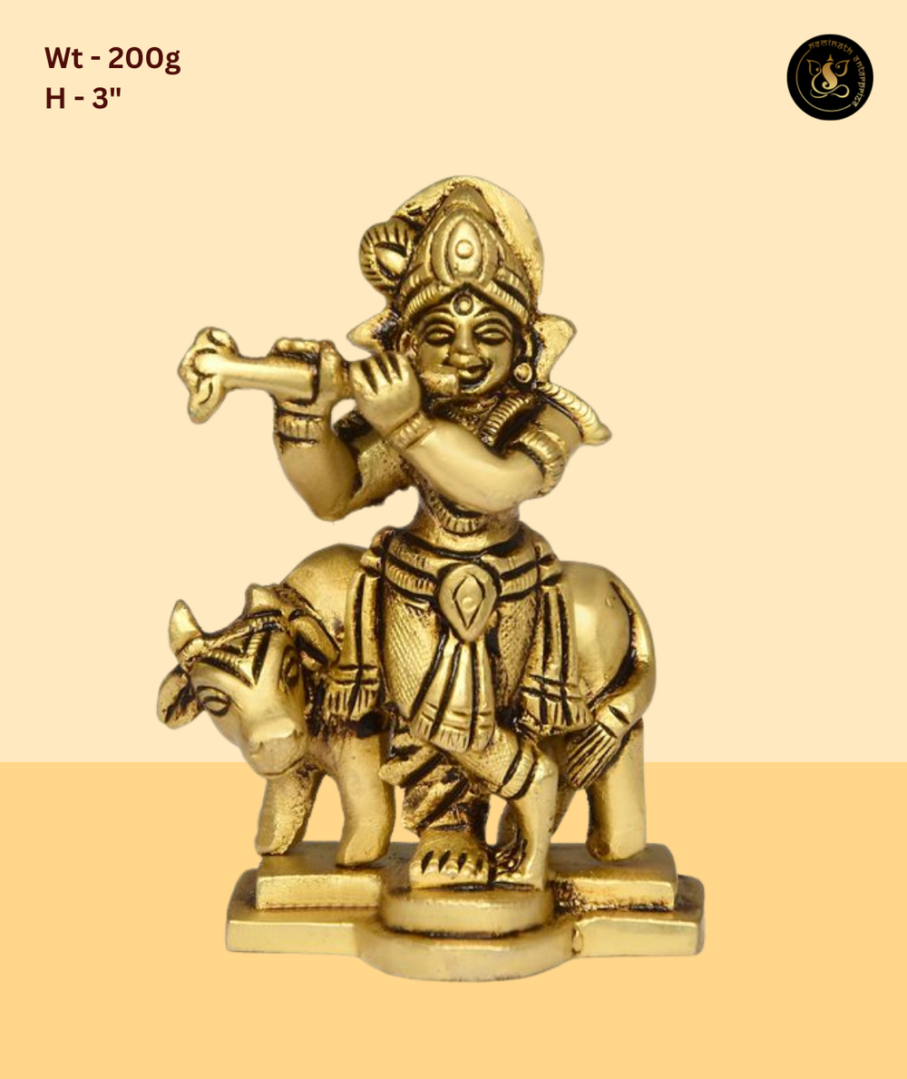 Small Krishna with cow, simple elegant design with smooth finish. This clean and elegantly crafted mini idol of Krishna with his beloved cow has a smooth antique brass finish. Its simplicity makes it versatile for gifting, travel altars, and desktop shrines. Finished in a beautiful antique gold brass tone, this idol radiates divine energy and is perfect for daily puja, home decor, and gifting on auspicious occasions such as Janmashtami, Diwali, Housewarming, and more.