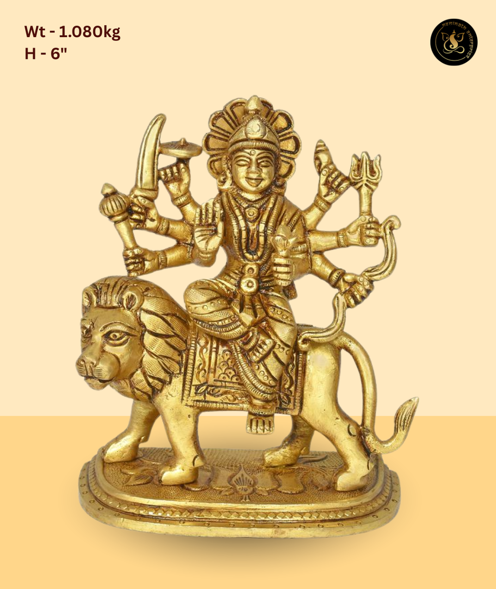 Crafted in high-quality brass finish, this Durga murti combines durability with timeless elegance. The detailed carving reflects traditional Indian artistry and devotion. Ideal for temple installations, long-term worship use, and gifting during festivals. The brass texture adds a rich and royal presence to your sacred space.
