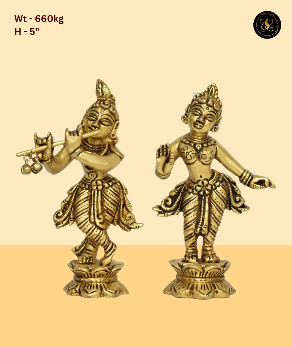 Krishna and Radha in separate dancing poses, each on their own lotus base. This lively pair captures both Krishna and Radha in expressive dancing poses, full of joy and divine energy. The individual lotus bases and contrasting postures make this a dynamic and visually exciting composition. Finished in a beautiful antique gold brass tone, this idol radiates divine energy and is perfect for daily puja, home decor, and gifting on auspicious occasions such as Janmashtami, Diwali, Housewarming, and more.