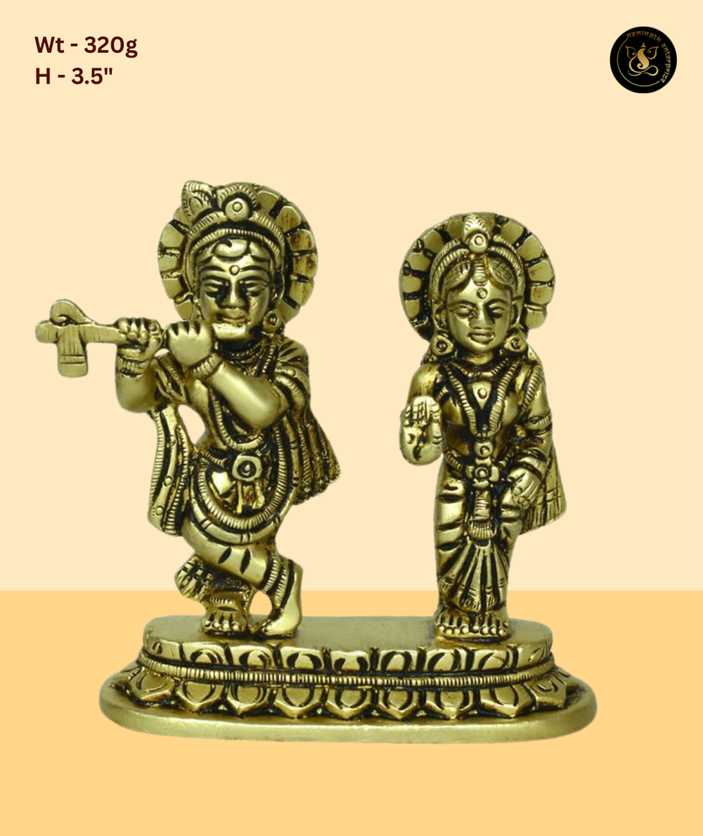 Small Radha and Krishna standing pair with detailed crowns and traditional attire on a flat base. This miniature duo captures the essence of the divine couple in fine detail despite its compact size. A perfect gift for devotees and an ideal idol for small home altars and travel pouches. Finished in a beautiful antique gold brass tone, this idol radiates divine energy and is perfect for daily puja, home decor, and gifting on auspicious occasions such as Janmashtami, Diwali, Housewarming, and more.