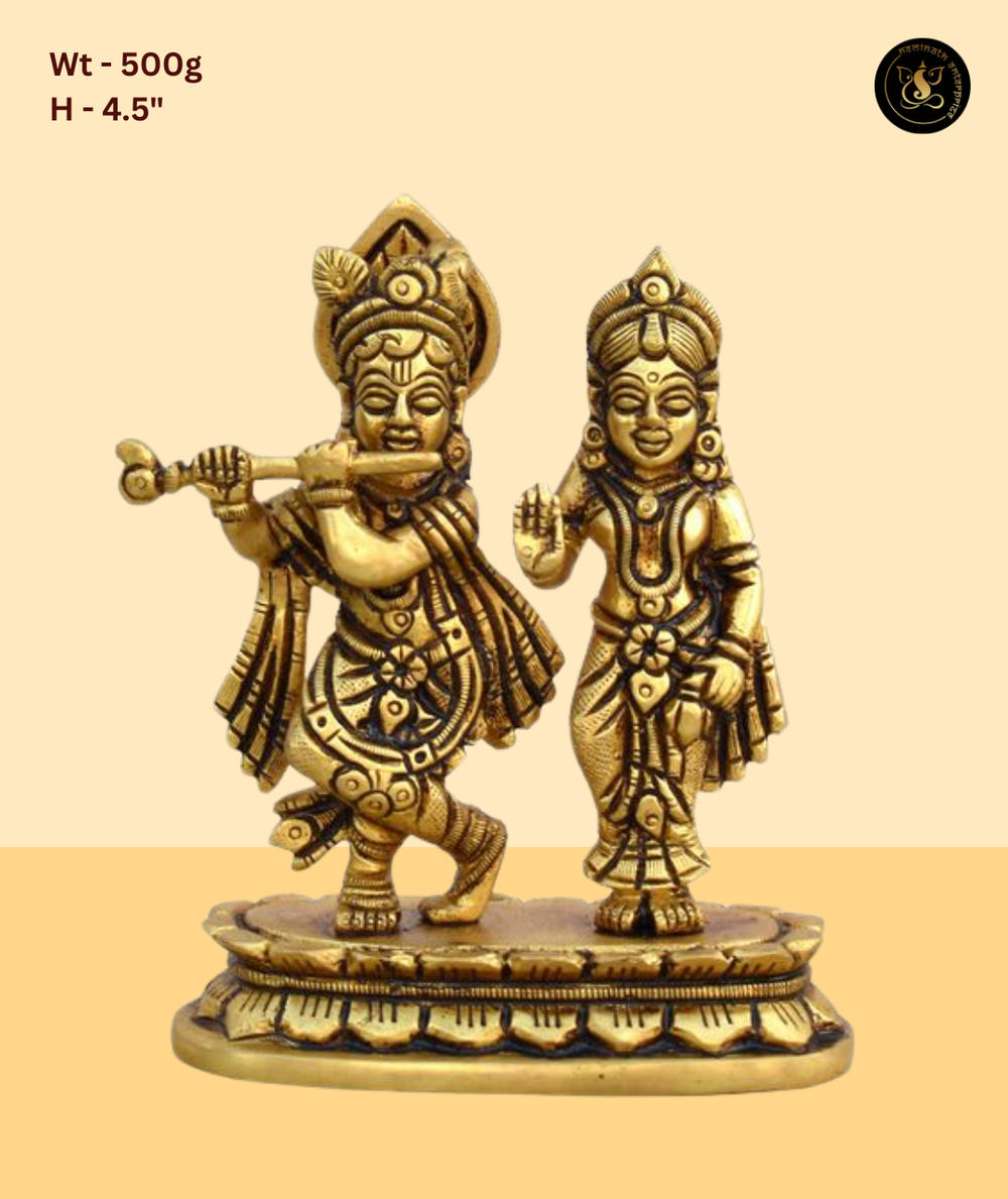 Radha and Krishna standing elegantly together on a lotus base. A classic depiction of the divine couple in matching ornate attire, this idol is ideal for home temples, pooja rooms, and as a meaningful gift on occasions like weddings, anniversaries, and Janmashtami. Finished in a beautiful antique gold brass tone, this idol radiates divine energy and is perfect for daily puja, home decor, and gifting on auspicious occasions such as Janmashtami, Diwali, Housewarming, and more.