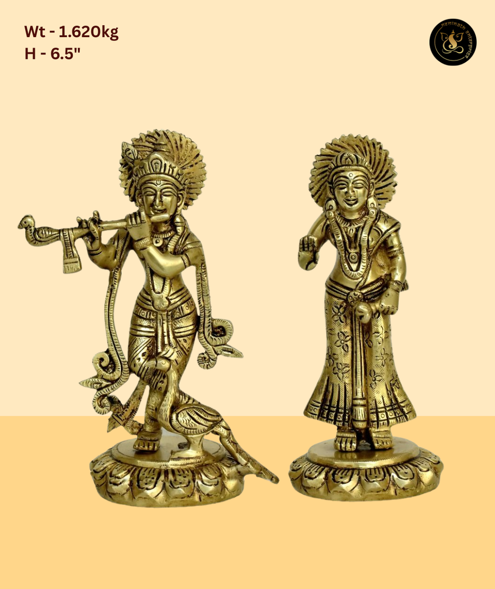Radha and Krishna as separate standing figures with ornate sun-ray crowns, each on a lotus base. This pair is crafted as two distinct individual idols presented together. The matching ornate halos and detailed attire make them a perfectly coordinated set for pooja rooms or decorative display. Finished in a beautiful antique gold brass tone, this idol radiates divine energy and is perfect for daily puja, home decor, and gifting on auspicious occasions such as Janmashtami, Diwali, Housewarming, and more.
