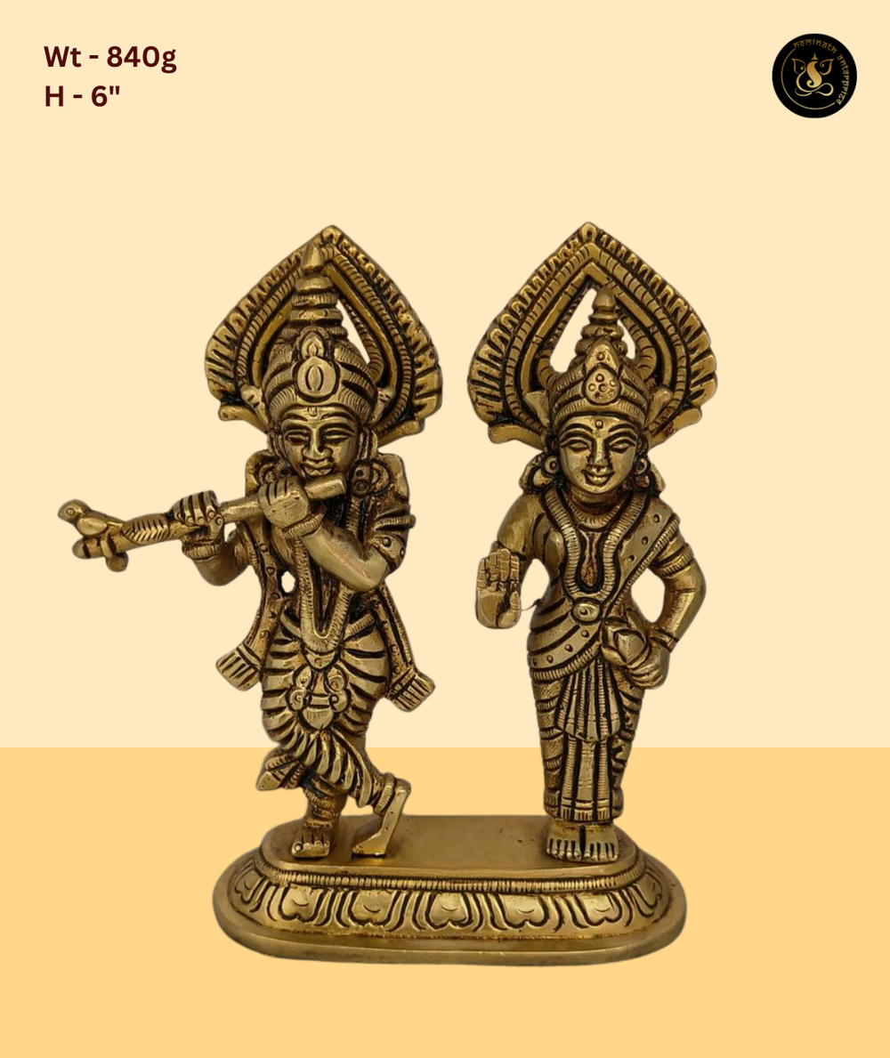 Radha and Krishna standing together on a flat oval base with ornate matching halos and crowns. This elegantly proportioned pair idol features matching halos and detailed attire for both Radha and Krishna, making it a harmonious and devotionally powerful sculpture for any sacred space. Finished in a beautiful antique gold brass tone, this idol radiates divine energy and is perfect for daily puja, home decor, and gifting on auspicious occasions such as Janmashtami, Diwali, Housewarming, and more.