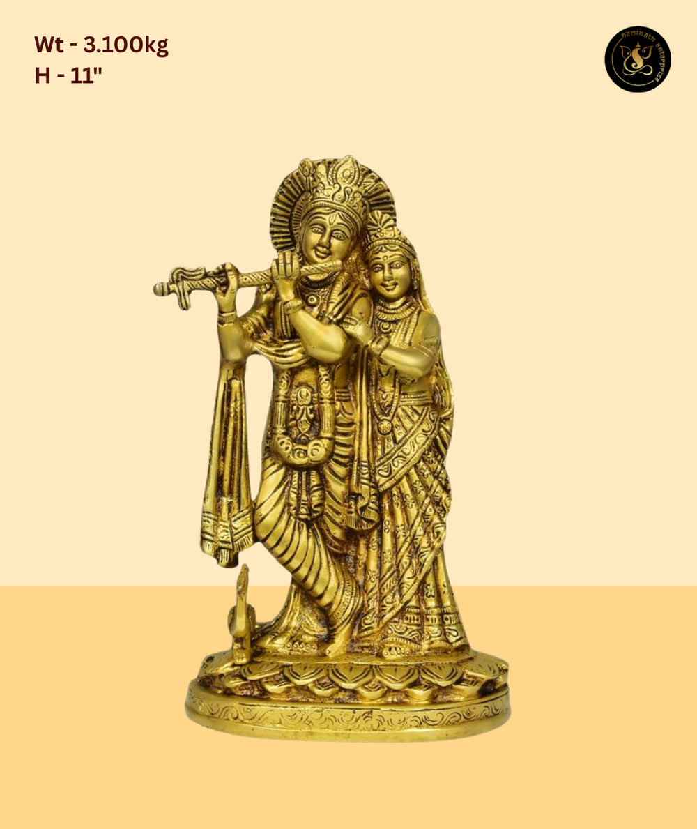 Large Radha Krishna in a loving embrace with peacock, on a circular petal base. This large and devotionally powerful idol captures the eternal love of Radha and Krishna in a tender embrace, with a peacock completing the divine scene. The circular petal base and intricate drapery add beauty and grace to this masterpiece. Finished in a beautiful antique gold brass tone, this idol radiates divine energy and is perfect for daily puja, home decor, and gifting on auspicious occasions such as Janmashtami, Diwali, Housewarming, and more.
