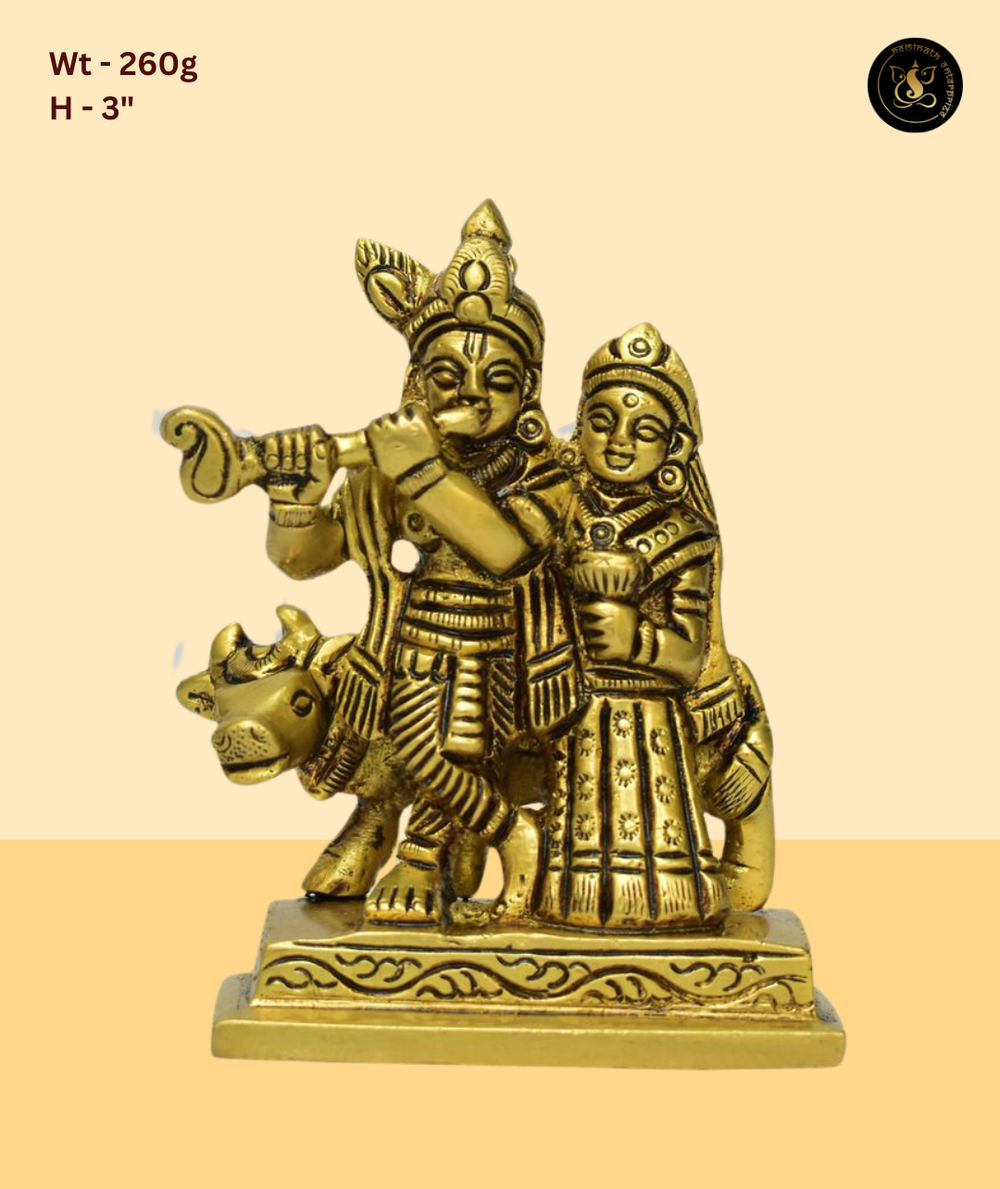 Mini Radha Krishna with cow on a rectangular base with decorative border. This small but detailed idol features the divine couple alongside Krishna's beloved cow, all on a decorative rectangular base. A sweet and spiritually meaningful miniature perfect for gifting and travel altars. Finished in a beautiful antique gold brass tone, this idol radiates divine energy and is perfect for daily puja, home decor, and gifting on auspicious occasions such as Janmashtami, Diwali, Housewarming, and more.