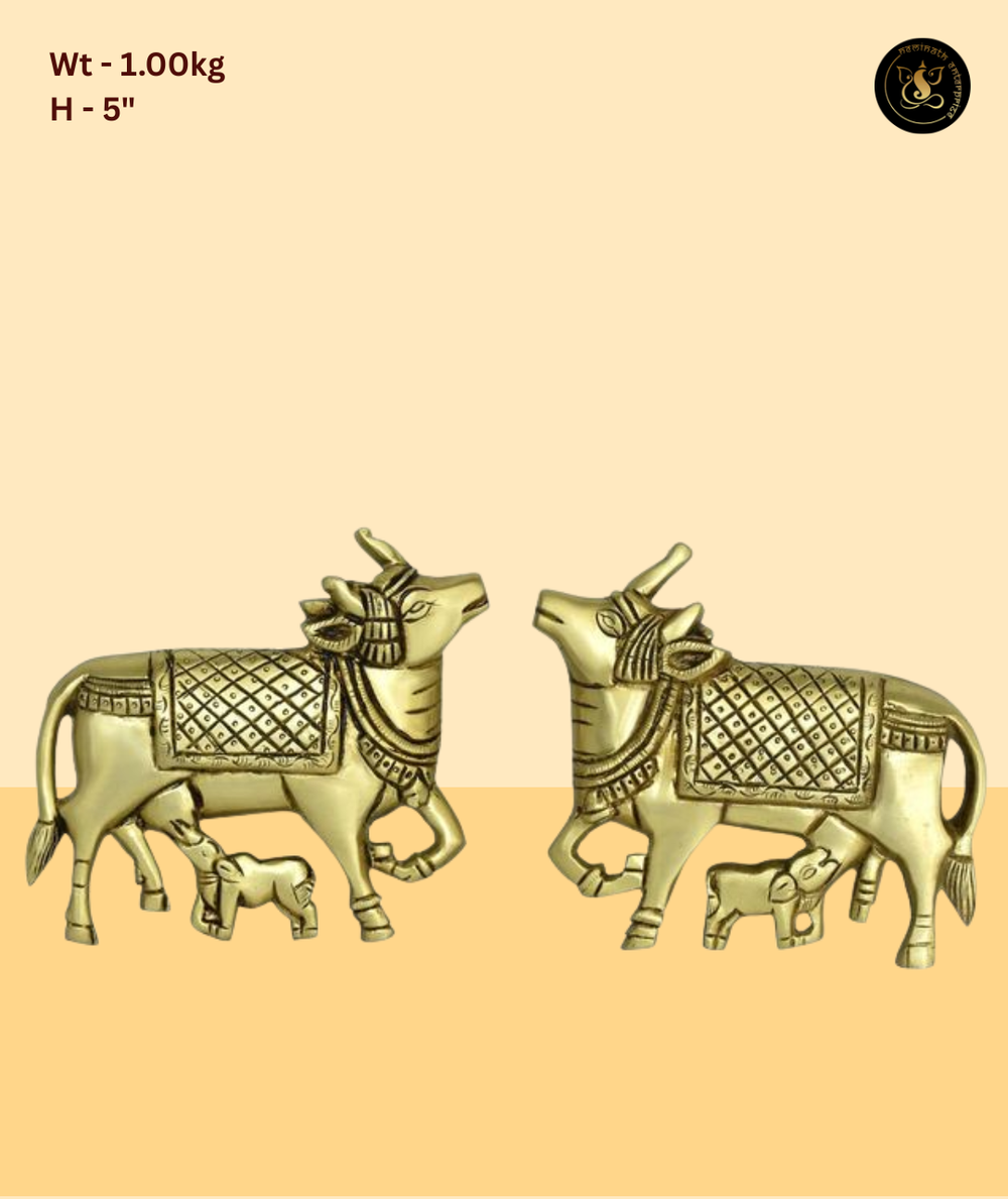 This standing pose brass cow and calf idol is perfect for adding a majestic look to your temple or home mandir. Expertly handcrafted, it symbolizes devotion, prosperity, and sacredness. The solid brass ensures stability and long-lasting shine. Ideal for festivals, pooja rituals, or as a centerpiece, this decorative idol brings both spiritual and aesthetic value to your home.